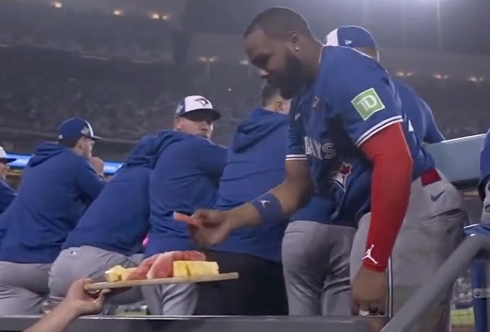 昨日の延長十八回の試合の途中でブルージェイズのベンチにフルーツの差し入れがあった