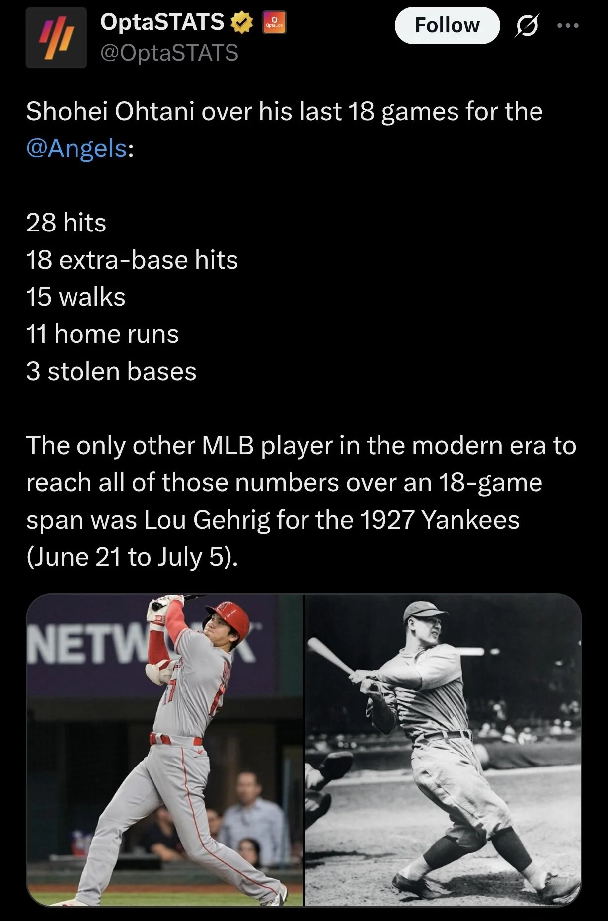 投手復帰にも取り組みながら昨年6月と同じペースを保っているなんて怪物的だよ