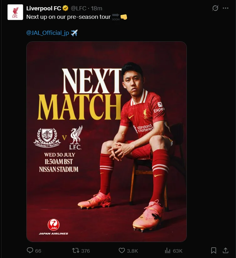 クラブ公式Xは「Konate x Endo」と2人のピッチ外でのやり取りを収めた動画を公開した。コナテが「ワタル!コンニチハ!」と日本語で挨拶をすると、歩み寄る遠藤も「こんにちは」と返す微笑ましいやり取りをかわしていた。コナテは『ドラゴンボール』や『進撃の巨人』など日本のアニメ、漫画好きで知られ、作品からインスピレーションを受けているともインタビューで語っていたこともある。
