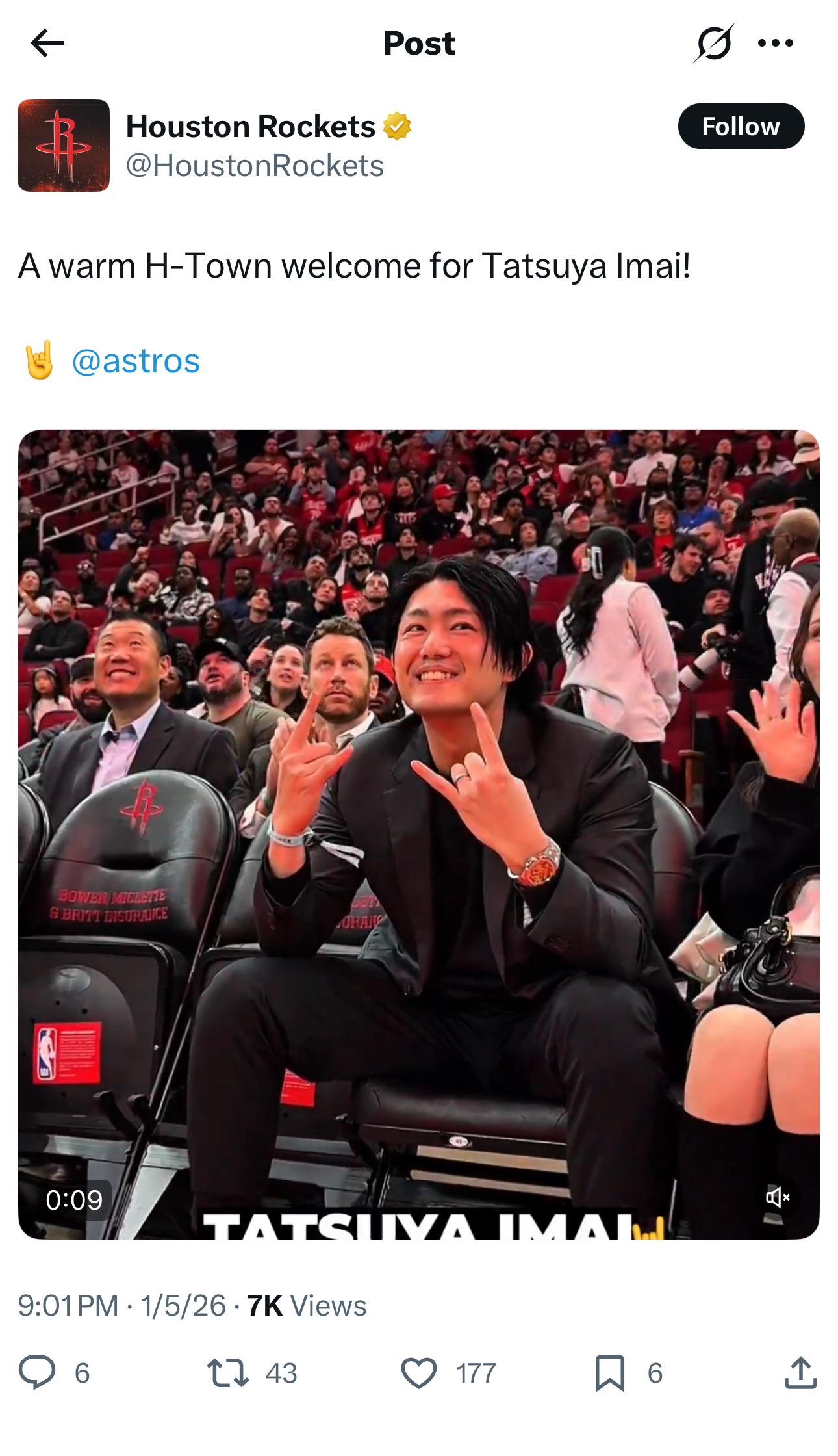 MLB公式Xも今井が会場で両手を上げる写真を投稿。「今井達也のヒューストンツアーはロケッツ戦観戦で続く」と記した。