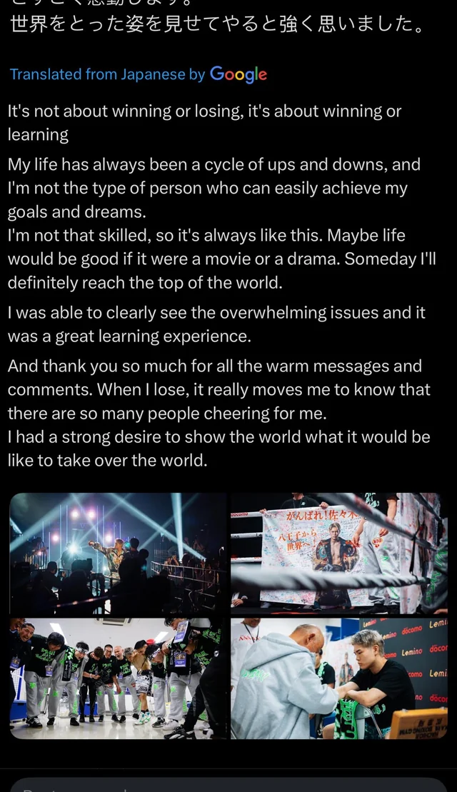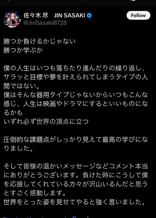 翻訳元:https://www.reddit.com/r/Boxing/comments/1lgvhab/jin_sasakis_message_to_his_fans_after_suffering/