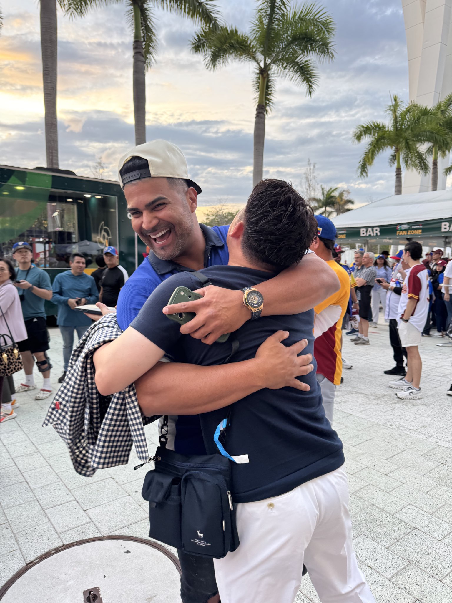 追記:これが試合前に杉谷(この画像ではそのポロシャツを脱いでいる)とメヒアがハグをしている様子