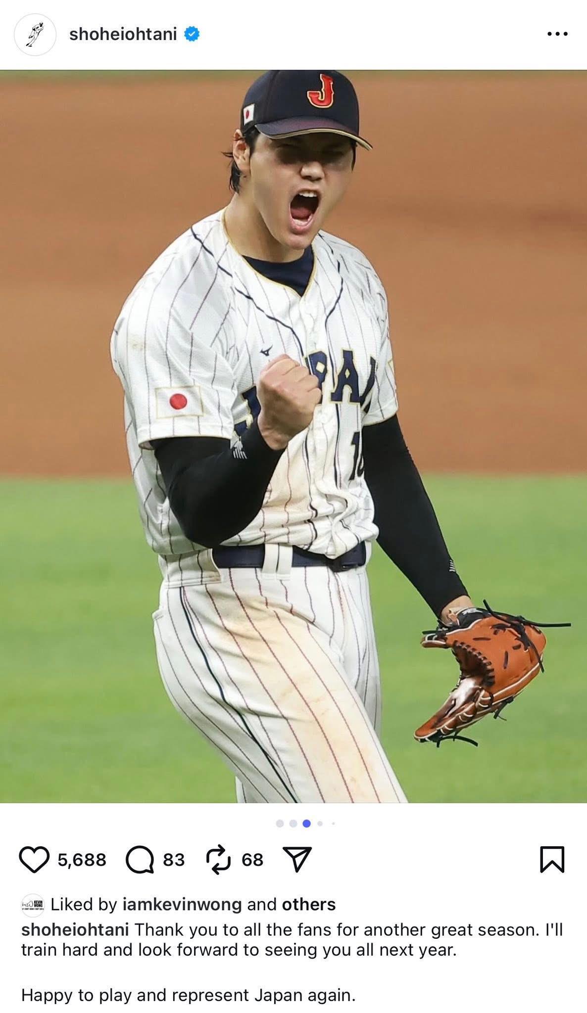 大谷はインスタグラムに、侍ジャパンの写真とともに、「日本を代表して再びプレーできることを嬉しく思う」と記載。来春に開催されるWBCへの参加を表明した。