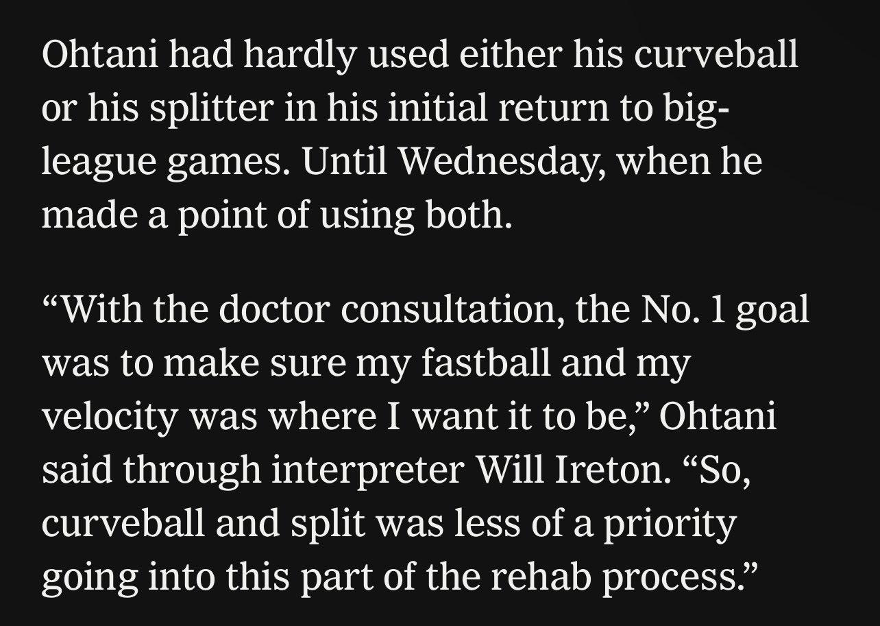 「メジャーでの投手復帰当初、大谷はカーブもスプリットはほぼ使わなかった。両球種を意識して投げることを決めた水曜日までは。『医師と相談した結果、一番の目標は直球と球速が納得行くレベルに達しているかを確認することだった」と大谷は通訳のウィル・アイアトンを介して語る。『だからこのリハビリ期間ではカーブとスプリットの優先度が低かった』」