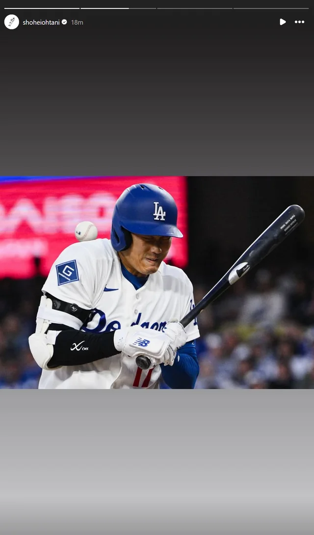 ドジャース大谷翔平投手(31)が、自身のインスタグラムのストーリーズを更新し、死球の瞬間と自身の驚きの表情などの写真を投稿した。